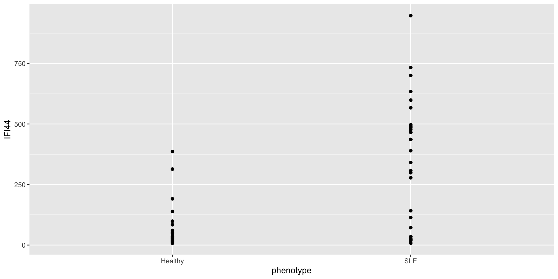 ggplot() and geom_point() are functions imported from the ggplot2 package, which is one of the “sub-packages” of the tidyverse package we loaded earlierMake a scatterplot of phenotype vs IFI44 (another gene in the dataset). The result should look like this: