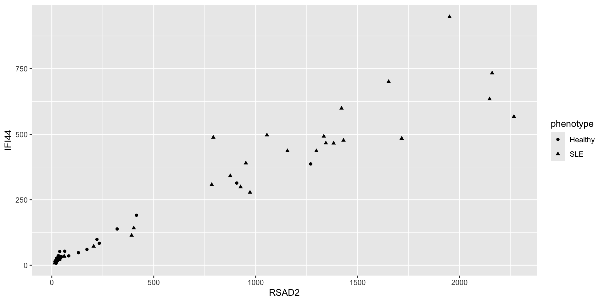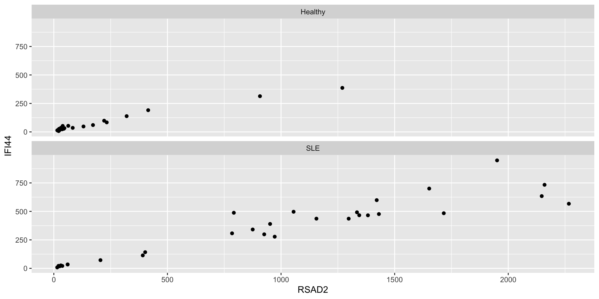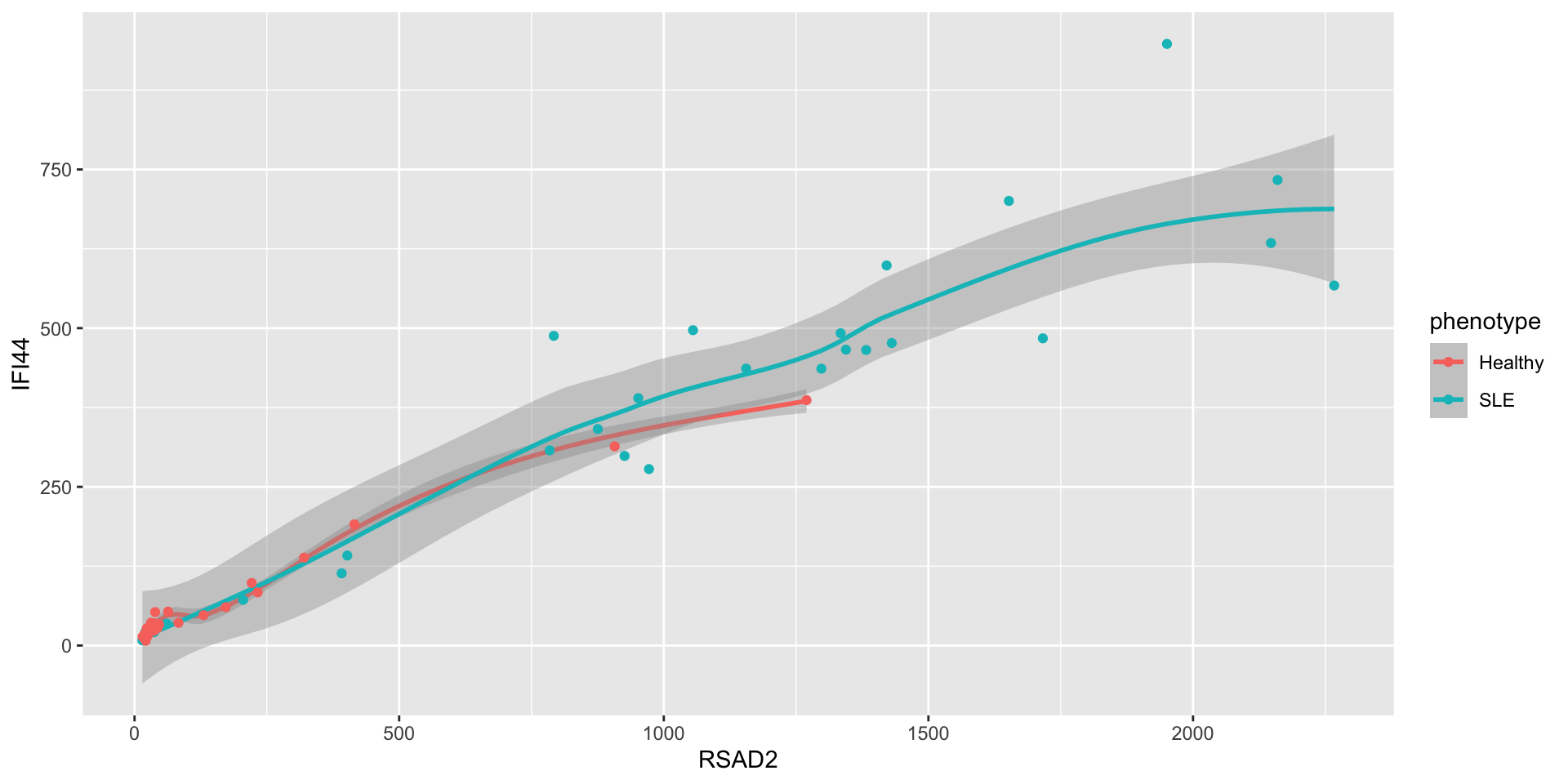 Let’s say we’re curious about the relationship between two genes RSAD2 and IFI44.