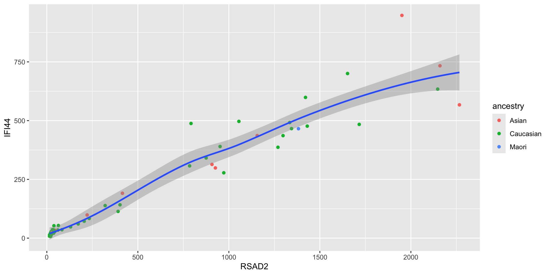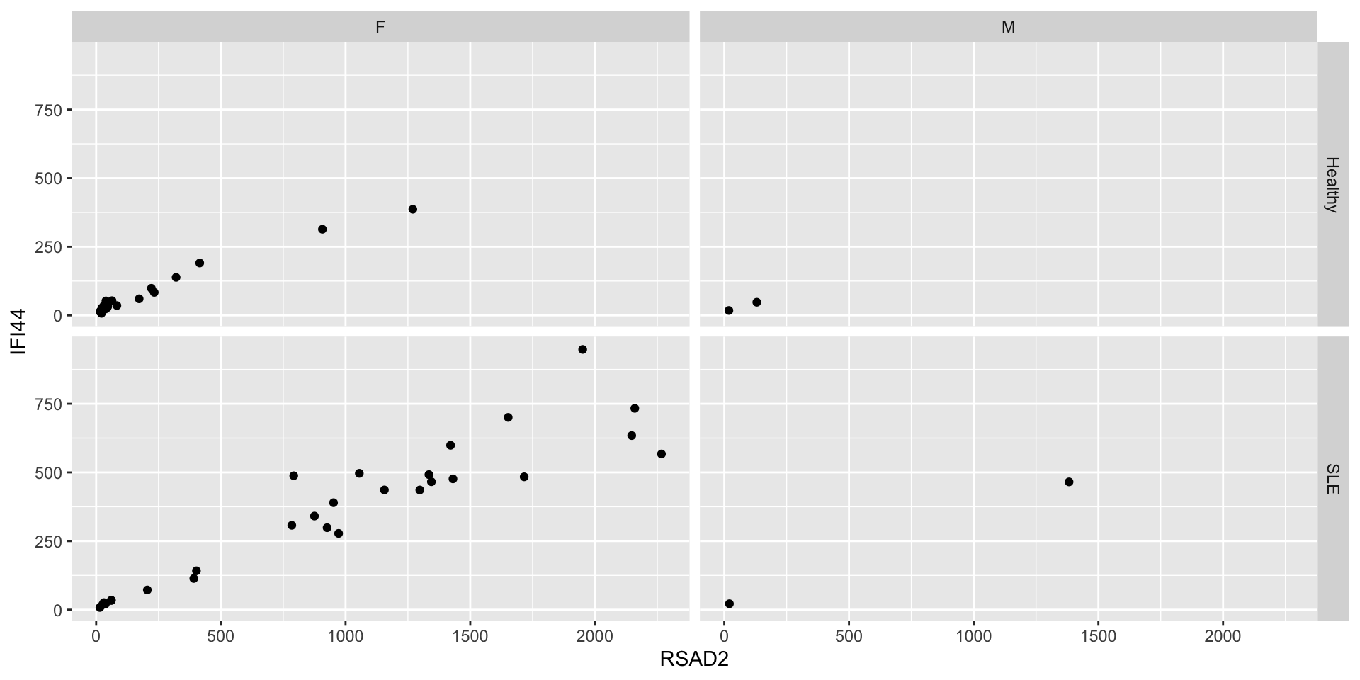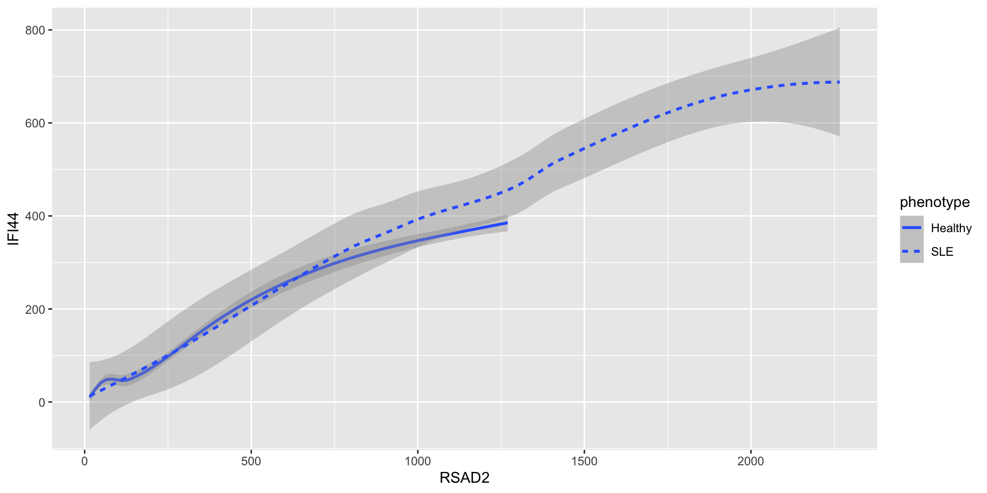 Let’s say we’re curious about the relationship between two genes RSAD2 and IFI44.