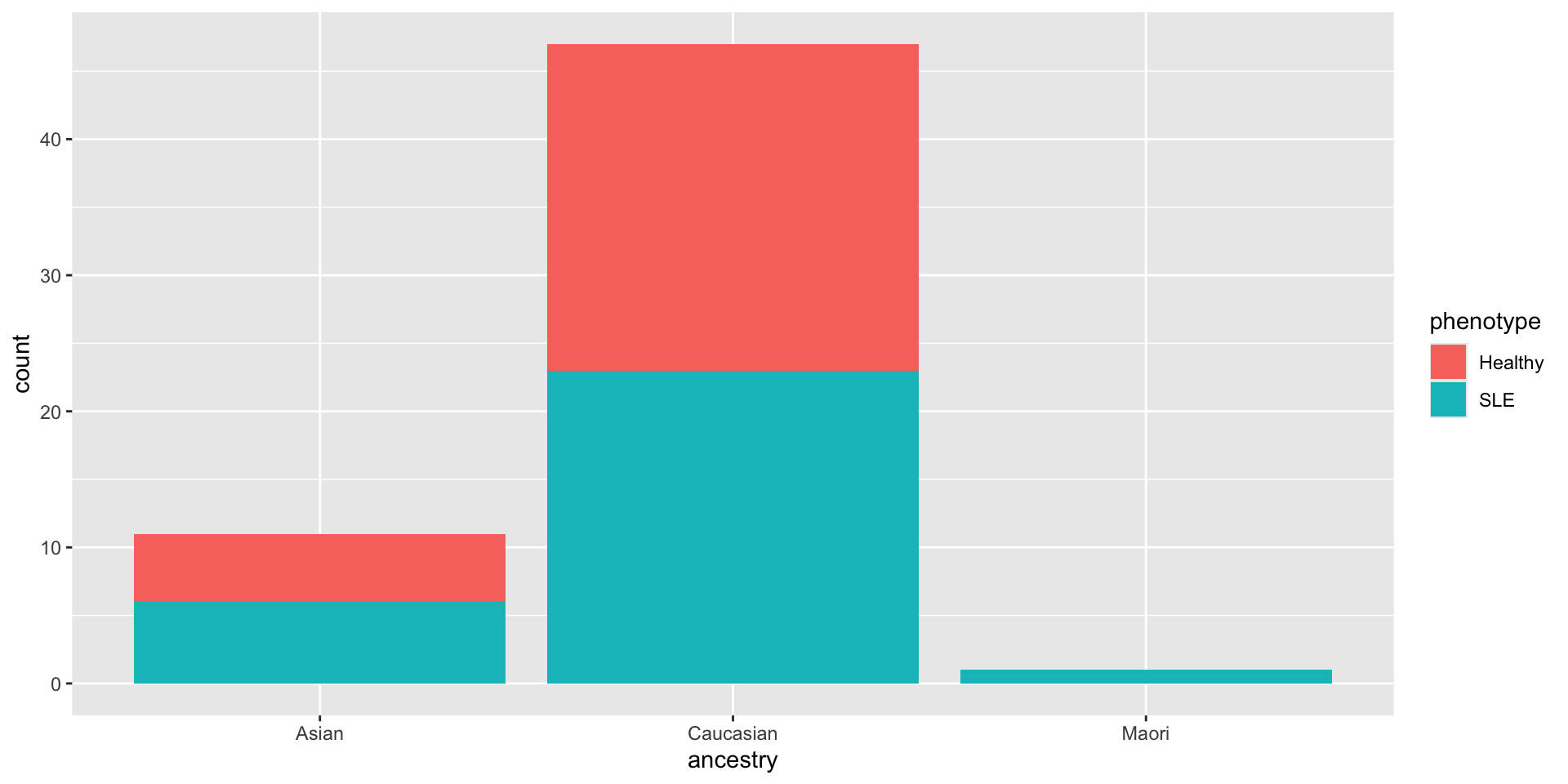 facet_wrap is good for faceting according to unordered categoriesfacet_grid is better for ordered categories, and can be used with two variablesUse ggplot to investigate the relationship between gene expression and lupus using any combination of any kinds of plots that you like. Which genes are most associated with lupus? Does this vary by ancestry, age, or assigned sex at birth?